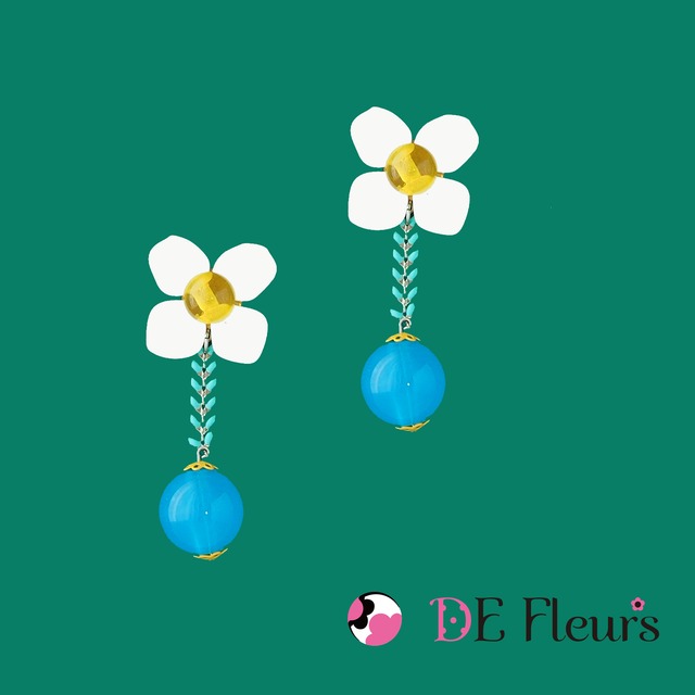これからの季節はヘアースタイルをアップにすると耳元が気になる!そんな時にキラキラ光るとかちょっと個性的かな?なイヤリングはどうかな? ど、アクセサリーくらい大胆で個性的な物を身につけて視線を集めてもOKよね。 ユラユラと揺れるイヤリングは素敵な風も運んでくれそうな予感がするかも。。。 オンラインショップでも随時アップしていきますが、いち早く購入されたい方はこちらからでも購入可能です。  商品説明 デフルールに因んで花*花*花にデフルールの代表的なボールや花を使った活発な女性にお届けしたいとおもいます。大ぶりな花にPOPなドットのブルーのボールをプラスして涼やかな感じとCuteで可愛らしさが2倍! デニムなどのカジュアルな服装に合わせても、もちろん結婚式、二次会のパーティードレスや普段のワンピースでも 大人可愛いスタイルにぴったりです。もちろん大切な方へのプレゼントにおすすめです。 意外とても軽い着け心地です。一つ一つ丁寧に作っておりますが雑に扱われますと破損いたします。 繊細な商品の為出来るだけ丁寧に扱って下さい。 インポートパーツにより若干の色の濃さ、形が違う場合があります。(たまに。。) 神経質な方はご遠慮ください  ピアスの長さ 約6.3cm ピアスの重さ(片方) 6.9g  素材 アクリル樹脂/ プラスチック / メッキ加工金属、またはチタン  パーツ変更 クリップ式イヤリング+100円 チタンピアス+130円(アレルギー対応あり) 樹脂ピアス+180円(アレルギー対応あり) ※アレルギー対応はポストパーツ部分になります。 ※チタンは金属になりますので、金属アレルギーが全くでない保証はできません。 ※樹脂ピアスは構造上、金属のような耐久性はございません。 キャッチの着脱時など無理な力が加わると、折れや破損の原因になりますのでご注意ください。  最後までお読みの上、ご注文いただきますようお願い致します。 こちらは受注製作となっており、お支払い確認後発送までに10日前後お時間をいただきます。 土日祝日を挟むと発送が遅れることがあります。ご了承ください。 ご住所の間違いがないか、ご注文前に必ずご確認をお願い致します。 【ラッピングは別途200円にてギフトBOXで承っております】 【振込手数料はご負担ください。送料は別途頂戴いたします】 【送料は別途400円掛かります】  購入の際の注意点 輸送時の破損や紛失はこちらでは補償できませんのでご了承ください。 ご購入者様のご都合による返品交換は受けかねます。 ご使用のモニターによっては現物と色味が異なる場合があります。
