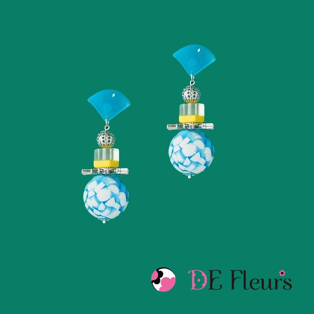 これからの季節はヘアースタイルをアップにすると耳元が気になる!そんな時にキラキラ光るとかちょっと個性的かな?なイヤリングはどうかな? ど、アクセサリーくらい大胆で個性的な物を身につけて視線を集めてもOKよね。 ユラユラと揺れるイヤリングは素敵な風も運んでくれそうな予感がするかも。。。 オンラインショップでも随時アップしていきますが、いち早く購入されたい方はこちらからでも購入可能です。  商品説明 デフルールに因んで花*花*花にデフルールの代表的なボールや花を使った女性らしい柔らかなカラーの組み合わせです。ラムネ菓子のような爽やかなブルー玉をシルバーの金具たちを使って夏のイメージで涼やかな感じで可愛らしさが2倍! デニムなどのカジュアルな服装に合わせても、もちろん結婚式、二次会のパーティードレスや普段のワンピースでも 大人可愛いスタイルにぴったりです。もちろん大切な方へのプレゼントにおすすめです。 意外とても軽い着け心地です。一つ一つ丁寧に作っておりますが雑に扱われますと破損いたします。 繊細な商品の為出来るだけ丁寧に扱って下さい。 インポートパーツにより若干の色の濃さ、形が違う場合があります。(たまに。。) 神経質な方はご遠慮ください  ピアスの長さ 約 7.0cm ピアスの重さ(片方) 14.7g  素材 アクリル樹脂/ プラスチック / メッキ加工金属、またはチタン  パーツ変更 クリップ式イヤリング+100円 チタンピアス+130円(アレルギー対応あり) 樹脂ピアス+180円(アレルギー対応あり) ※アレルギー対応はポストパーツ部分になります。 ※チタンは金属になりますので、金属アレルギーが全くでない保証はできません。 ※樹脂ピアスは構造上、金属のような耐久性はございません。 キャッチの着脱時など無理な力が加わると、折れや破損の原因になりますのでご注意ください。  最後までお読みの上、ご注文いただきますようお願い致します。 こちらは受注製作となっており、お支払い確認後発送までに10日前後お時間をいただきます。 土日祝日を挟むと発送が遅れることがあります。ご了承ください。 ご住所の間違いがないか、ご注文前に必ずご確認をお願い致します。 【ラッピングは別途200円にてギフトBOXで承っております】 【振込手数料はご負担ください。送料は別途頂戴いたします】 【送料は別途400円掛かります】  購入の際の注意点 輸送時の破損や紛失はこちらでは補償できませんのでご了承ください。 ご購入者様のご都合による返品交換は受けかねます。 ご使用のモニターによっては現物と色味が異なる場合があります。